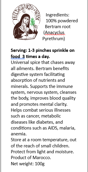 Bertram ma korzystny wpływ na układ trawienny, ułatwiając wchłanianie minerałów i składników odżywczych. Wspomaga układ odpornościowy, układ nerwowy i usuwa flegmę. Stosować w ilościach zalecanych na opakowaniu.
