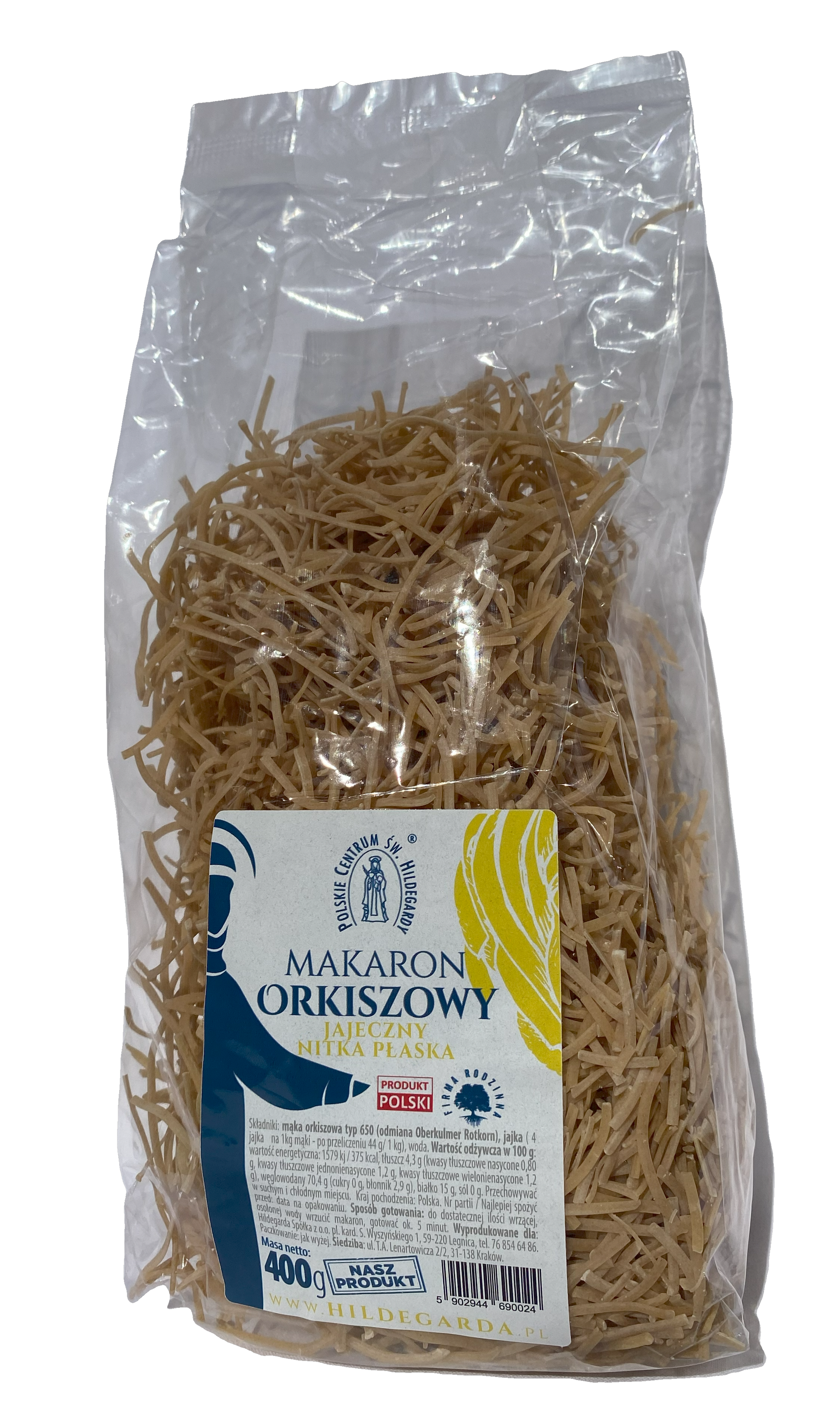 Makaron sporządzony z mąki orkiszowej. Doskonały do przygotowania dań podstawowych oraz jako dodatek do rosołu, zup, a także wszelakich zapiekanek. Makaron orkiszowy jest doskonałą, Hildegardową propozycją kulinarną do przyrządzania dań podstawowych (np. różnorodnych zapiekanek), sałat, sałatek, uzupełniania zup, a także łączenia z aromatycznymi owocami (jabłka, wiśnie, maliny) oraz z przyprawami.