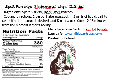 According to St. Hildegard of Bingen, spelt grain is invaluable in daily nutrition. It is an excellent addition to all kinds of soups, salads, pâtés (both meat and vegetable), and main dishes (breakfast, lunch, dinner). The grain can also be added to cookies, and desserts.
